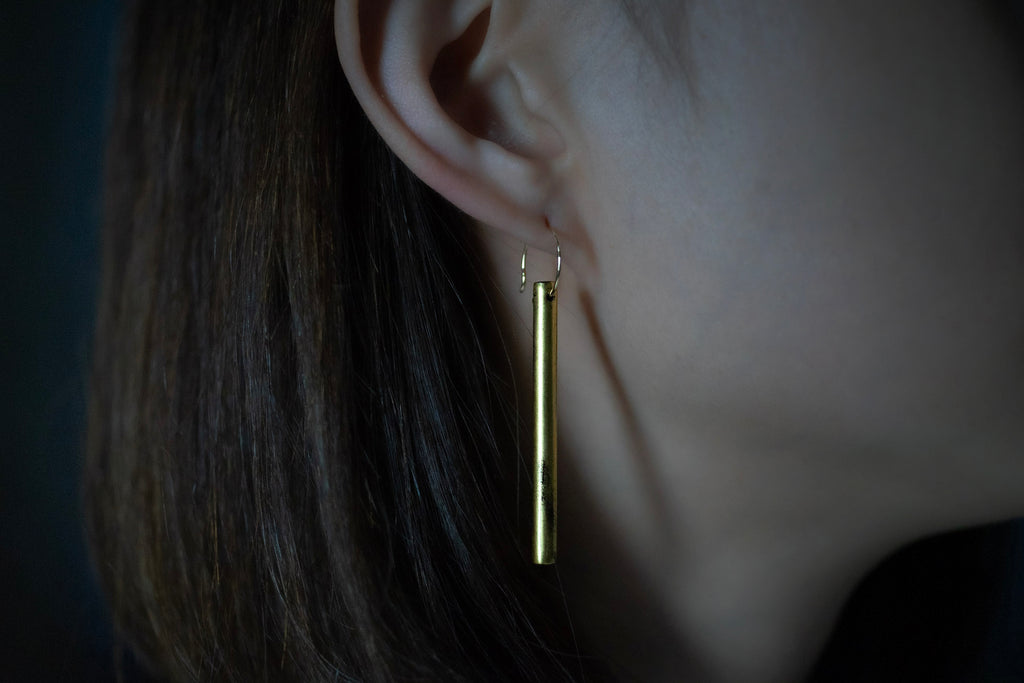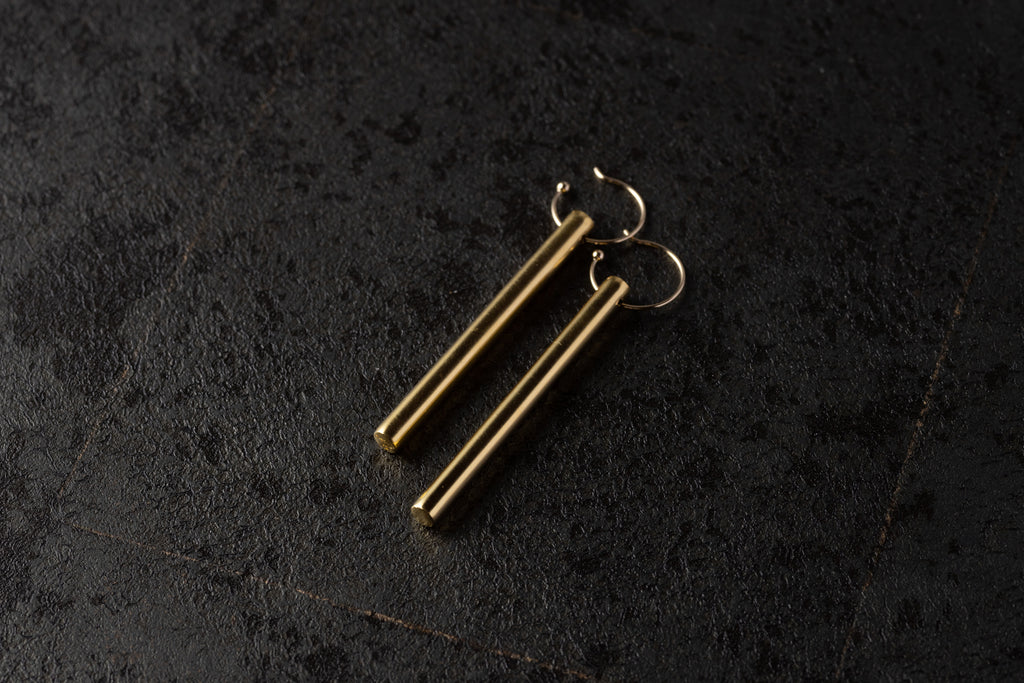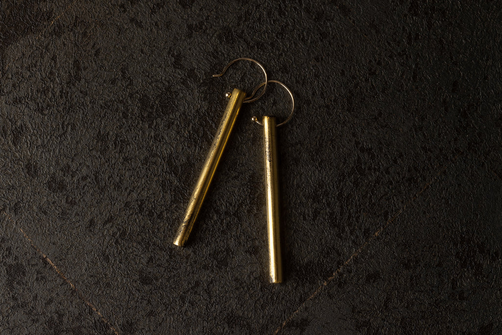 下地、研ぎ、塗りをの工程を経た黒艶の漆塗りの上に 金箔押しを施した漆金箔のピアス。修繕前の寺院の柱から着想したデザインです。