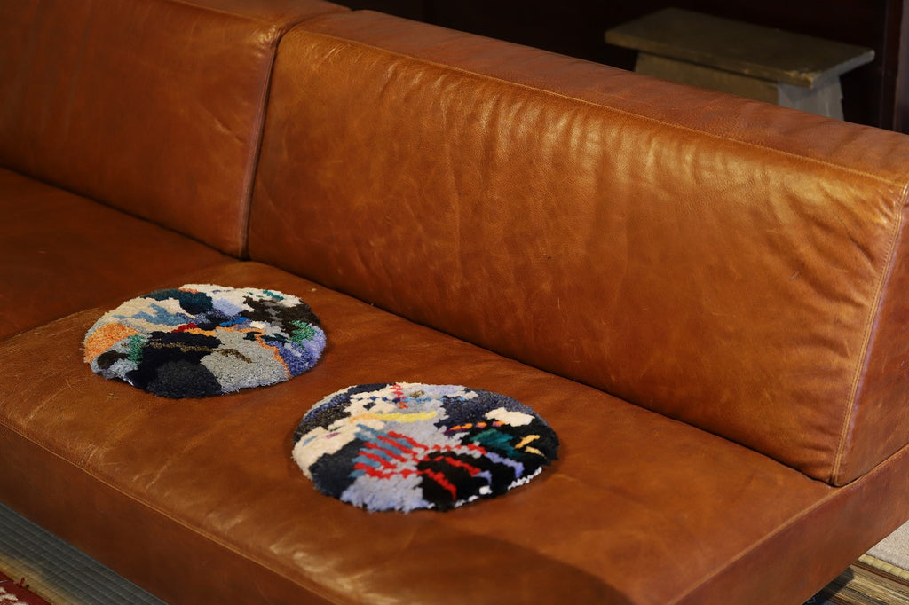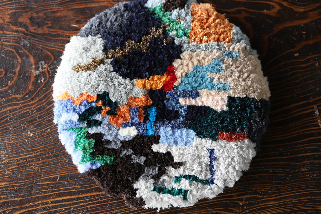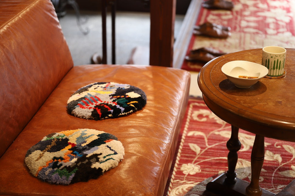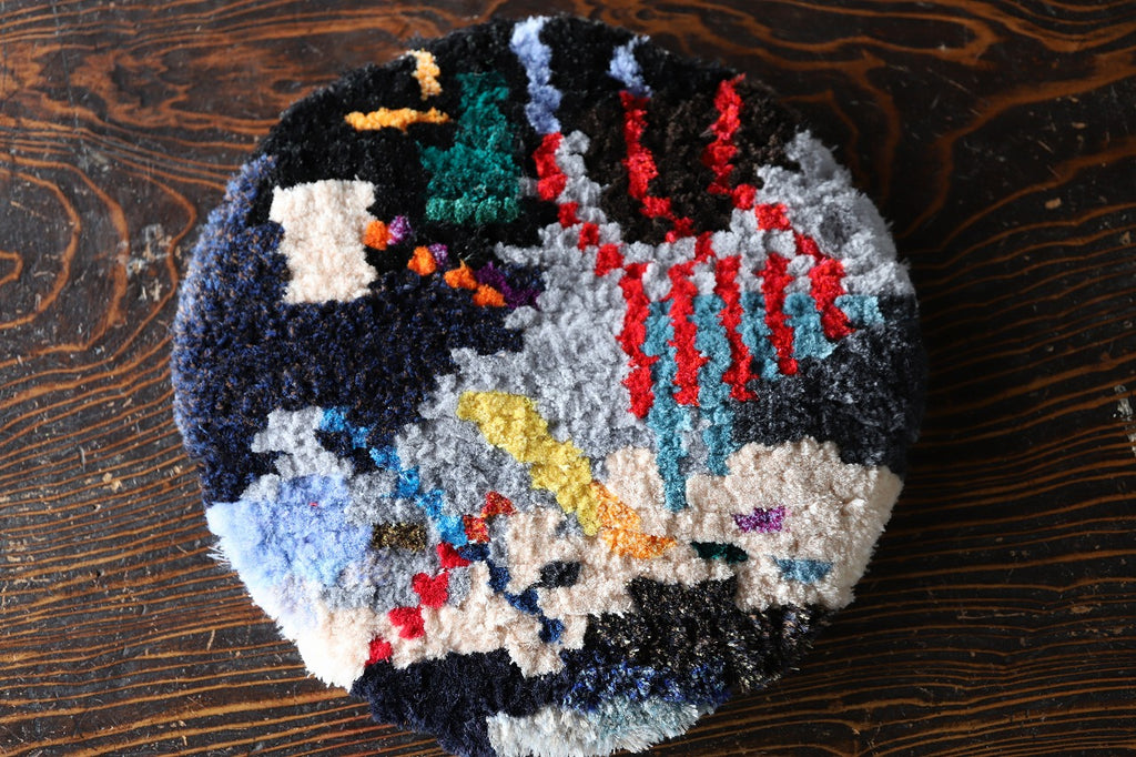 Fritt(自由に)と名付けられた丸形の椅子敷き 様々な糸をグラフィカルに配置したそれぞれ一点限りのデザインです