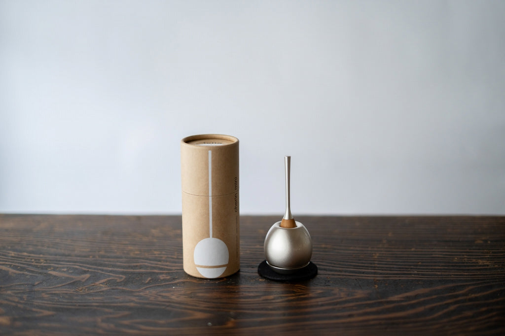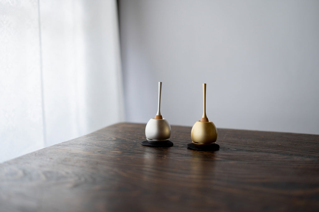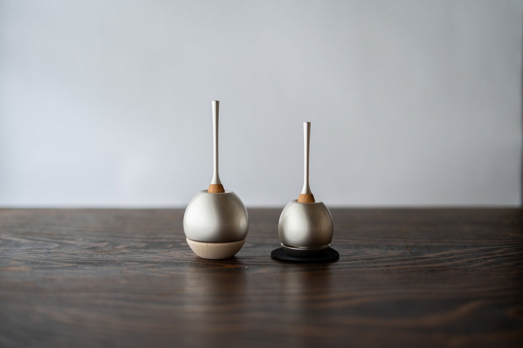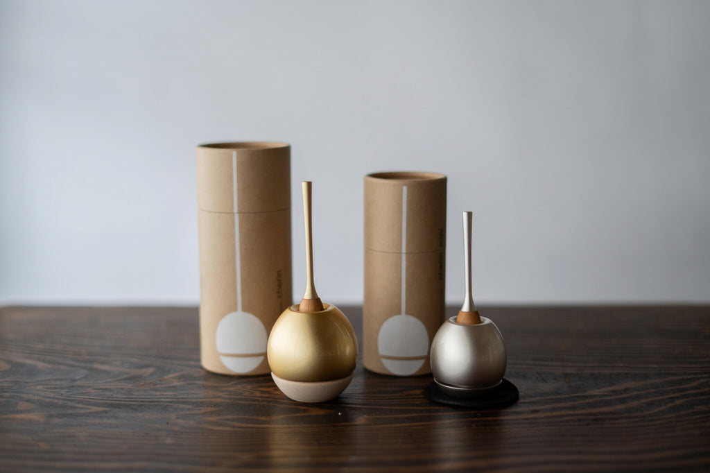このCherinシリーズは、りん棒がおりんにそっと置いて収納されている素敵な佇まいが特徴です。りん棒を手に取り、おりんを鳴らした後 おりんの中に戻しても音が鳴りやむことはありません。新しい所作と、柔らかい音色で 静かな祈りの時が生まれます