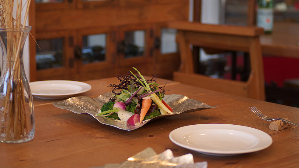 柔らかくて形は変幻自在。丸い麺棒でまっすぐなもので伸ばせば、元通りの平らな錫板にもどります。錫には抗菌作用があり、直接食品を置いてお使いいただけます。