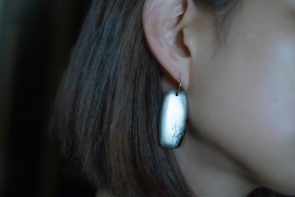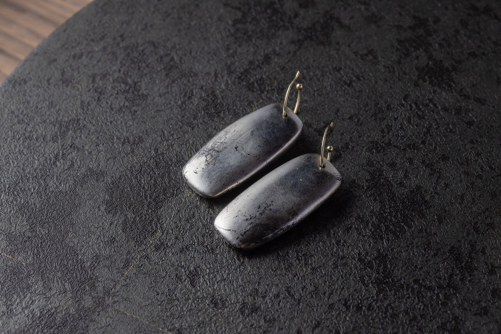 下地、研ぎ、塗りをの工程を経た黒艶の漆塗りの上に プラチナ箔押しを施したプラチナ箔のピアス。
