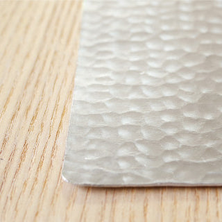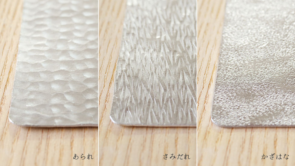 薄く圧延された錫の板に、ひとつひとつ金槌で模様をつけていきます。叩き締めることで薄い板の強度は増し、何度も形状を変化させて使うことができるようになります。