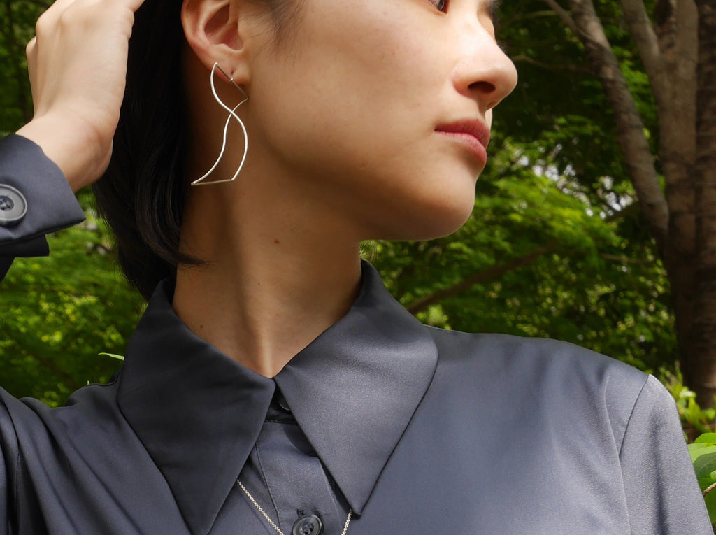 オブジェのようなたたずまいが特徴的なピアスです。細い線で構成されたモチーフは、ポストに固定されておらず くるくると好きな方向に回転して装着することができます。いつもありのままの自然体のあなたへ贈るジュエリーです